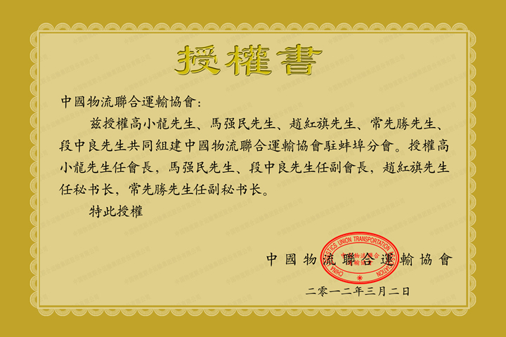 中国物流联合运输协会蚌埠分会授权书